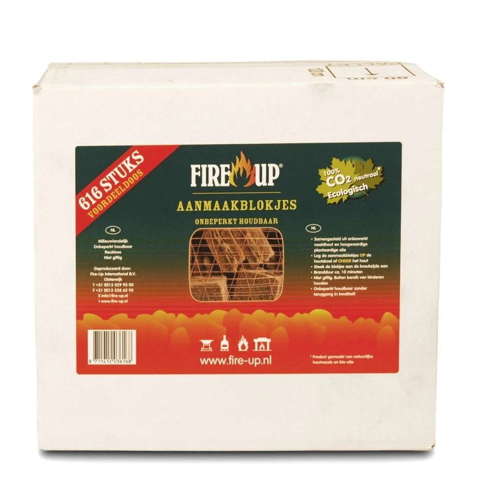 De milieuvriendelijke en bruine aanmaakblokjes van Fire-Up bestaan uitsluitend uit biologische materialen. Dit product bestaat uitsluitend uit plantaardige grondstoffen, aan de aanmaakblokjes zijn geen chemicaliën toegevoegd. Hierdoor zijn ze veilig aan te steken en geven zij geen smaak af aan het gerecht op de BBQ.