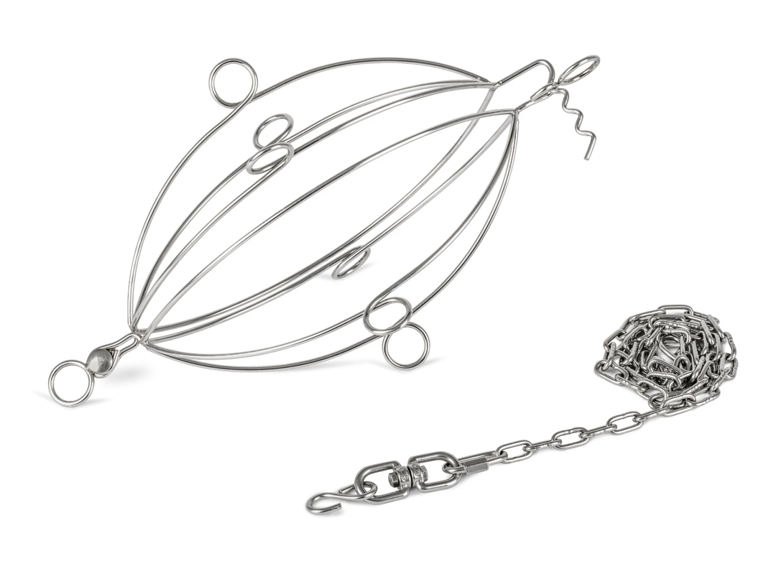Door de twee helften van de mand te bevestigen, wordt de inhoud stevig vastgeklemd en kan er direct boven het open vuur worden gekookt. De wartel draagt bij aan een gelijkmatig kookresultaat en de schakelketting met in totaal 8 ophanglussen, waarin de grillmand kan worden gehangen, stelt je in staat de temperatuur stapsgewijs te regelen.